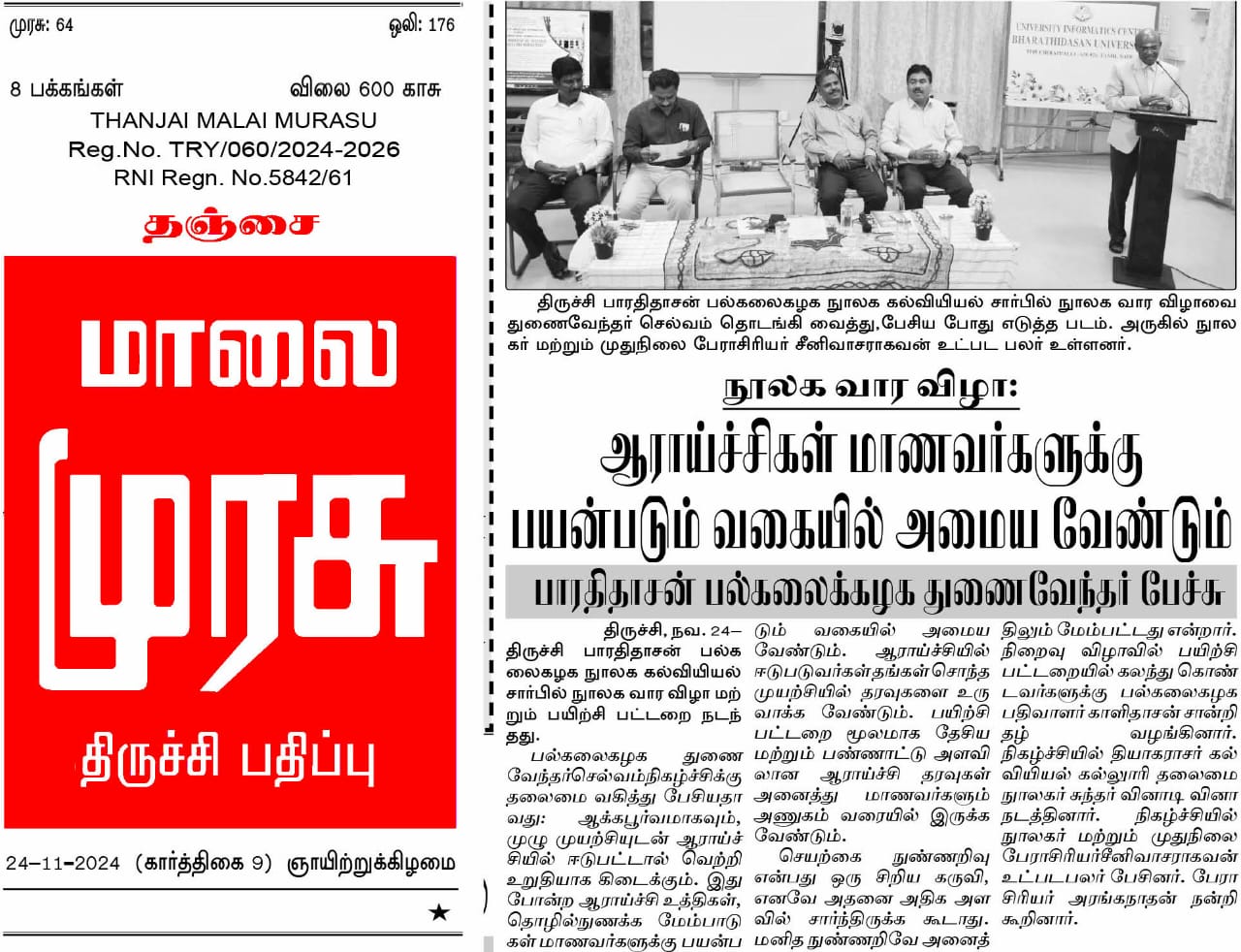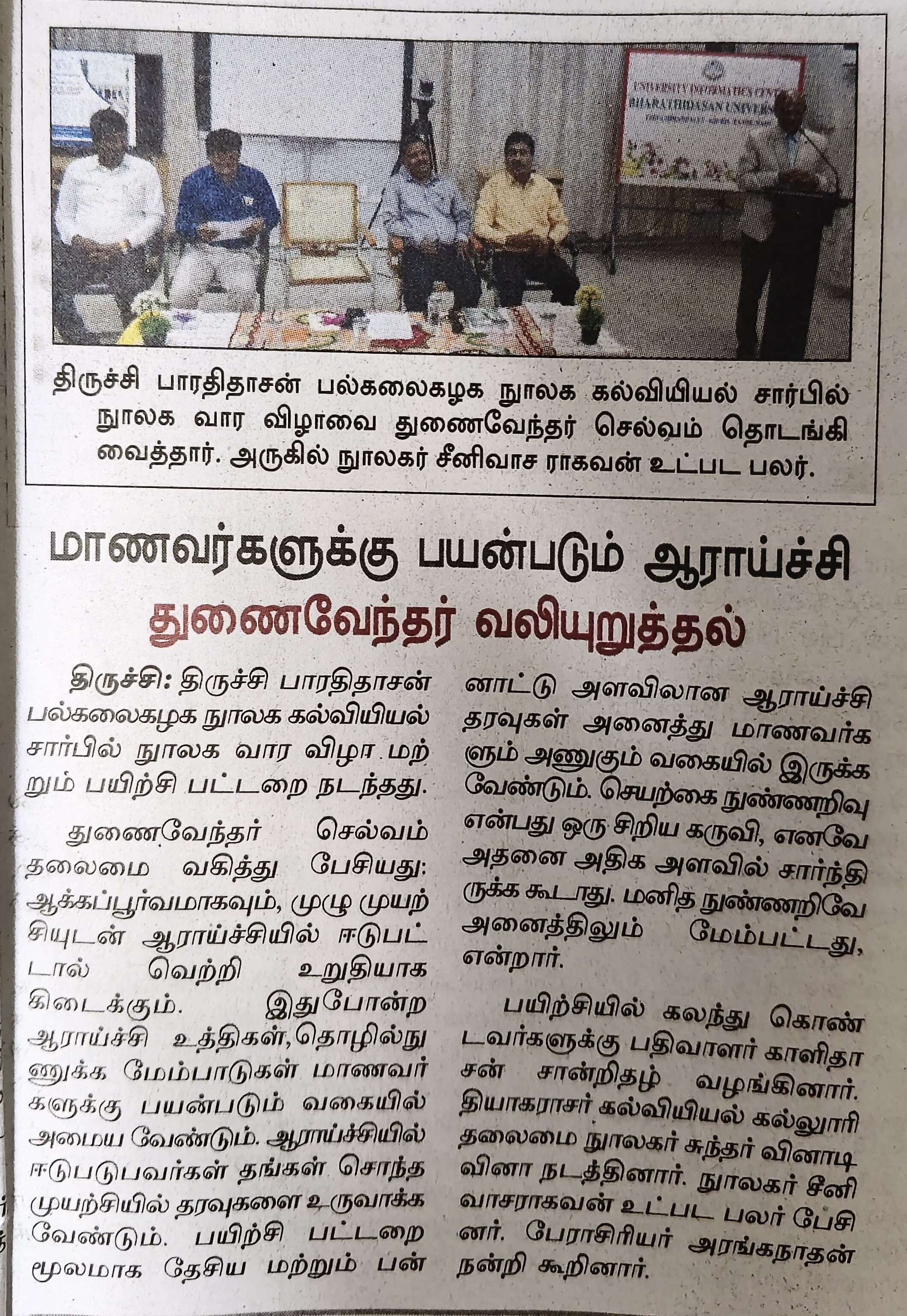 | Abstract: | National Library Week Celebrations -2024 and National Workshop on "Research Data Access and Management" organized by School of Library and Information Science, Bharathidasan University on 21.11.2024 |