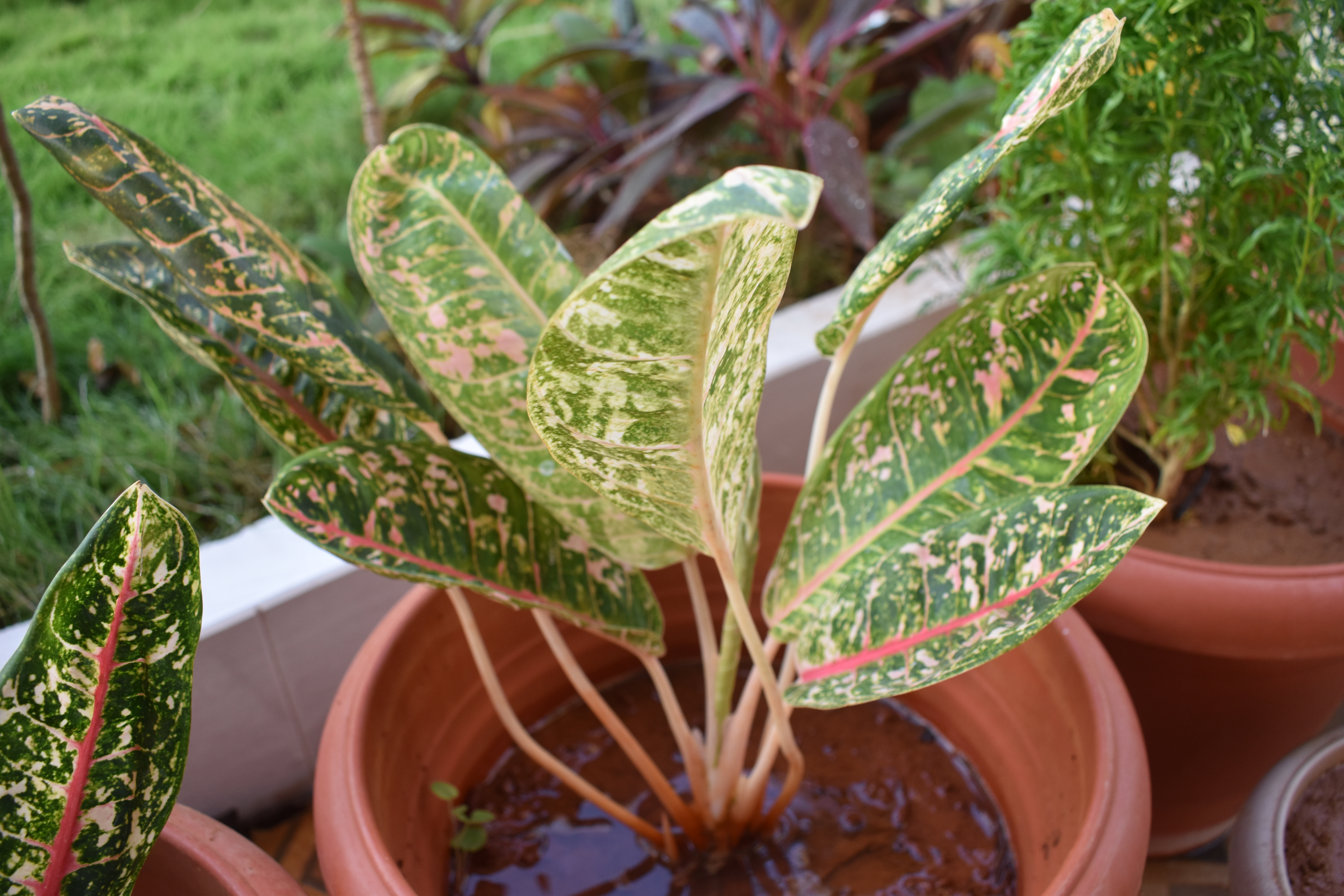 Description: Common Name: Chinese Evergreen | Binomial Name: Aglaonema commutatum Schott | Tamil Name: சீன எவர்கிரீன் | Family: Araceae | Photo Credit: Akash K | Location: BDU Guest House